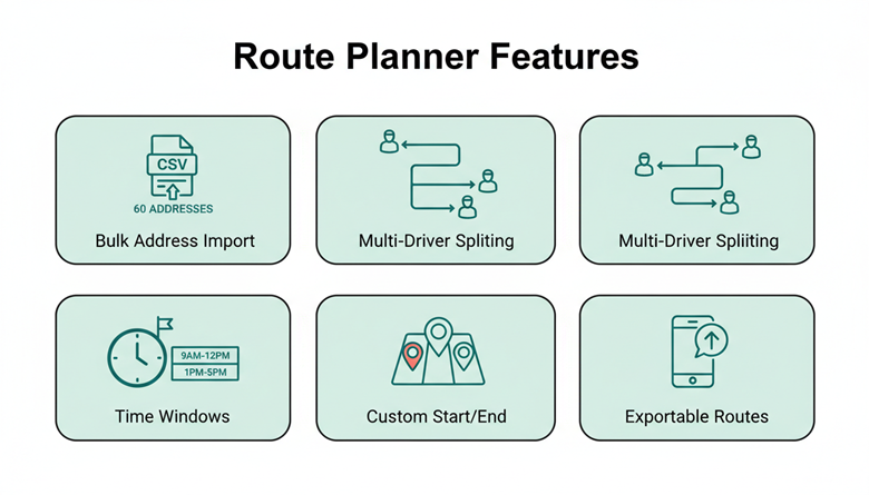 Exportable routes. Once routes are built, drivers need them on their phones in seconds. CSV download, shareable link, or push to a driver app. If the only option is a screenshot of a map, it does not work at scale.