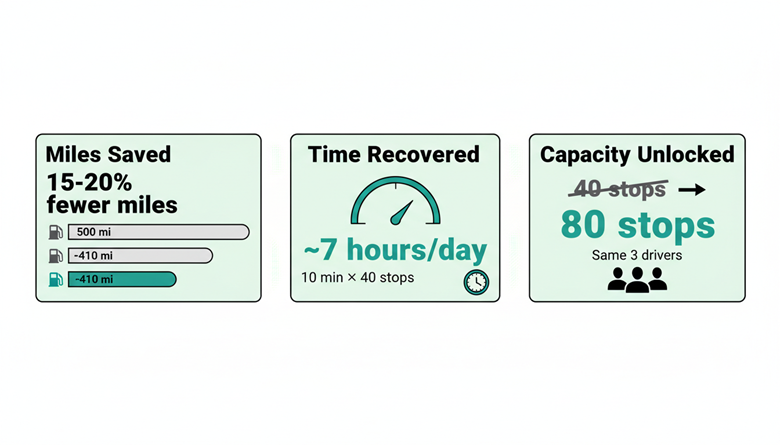 A three-driver operation doing 40 stops per day can often push to 70 or 80 just by eliminating wasted miles and idle time between deliveries.
